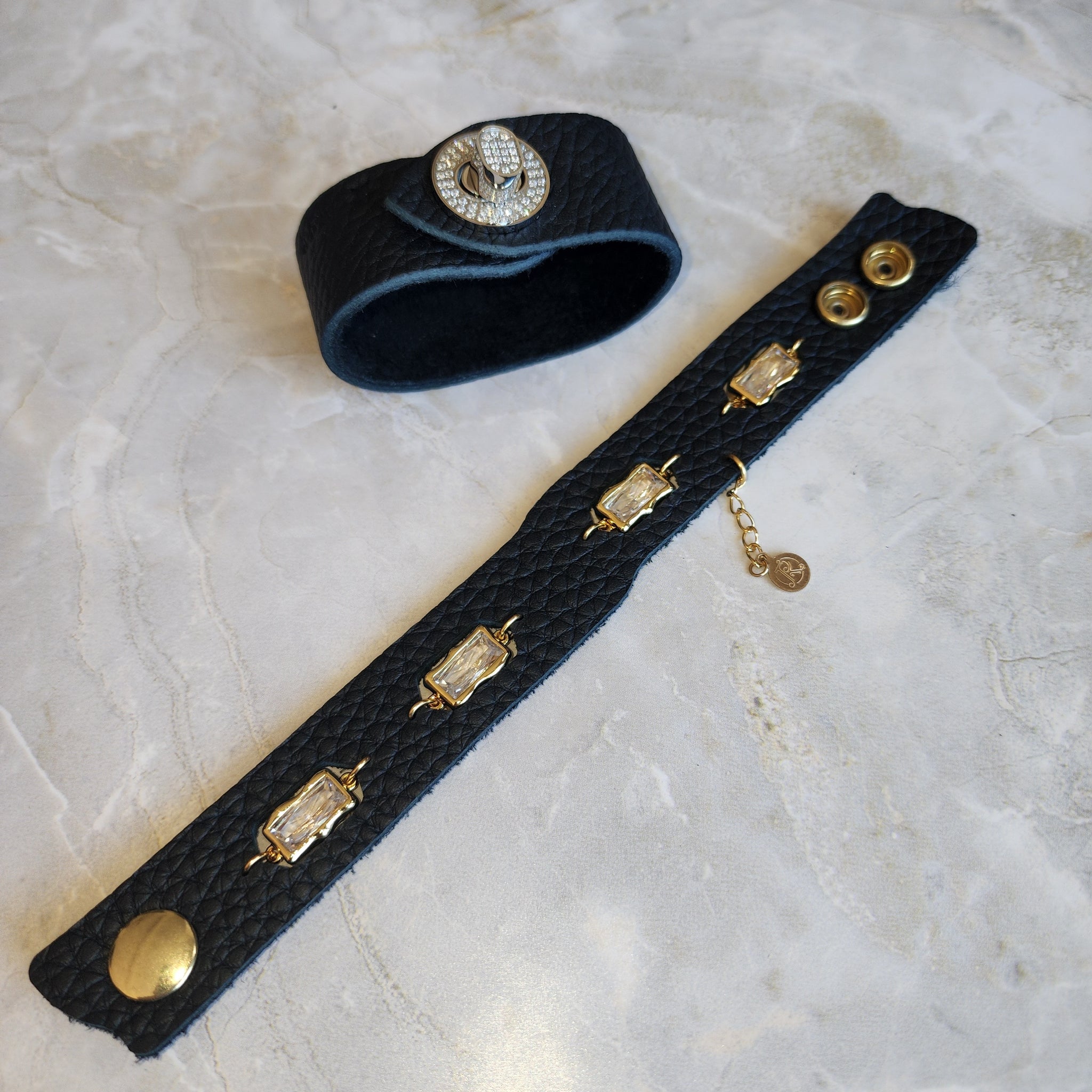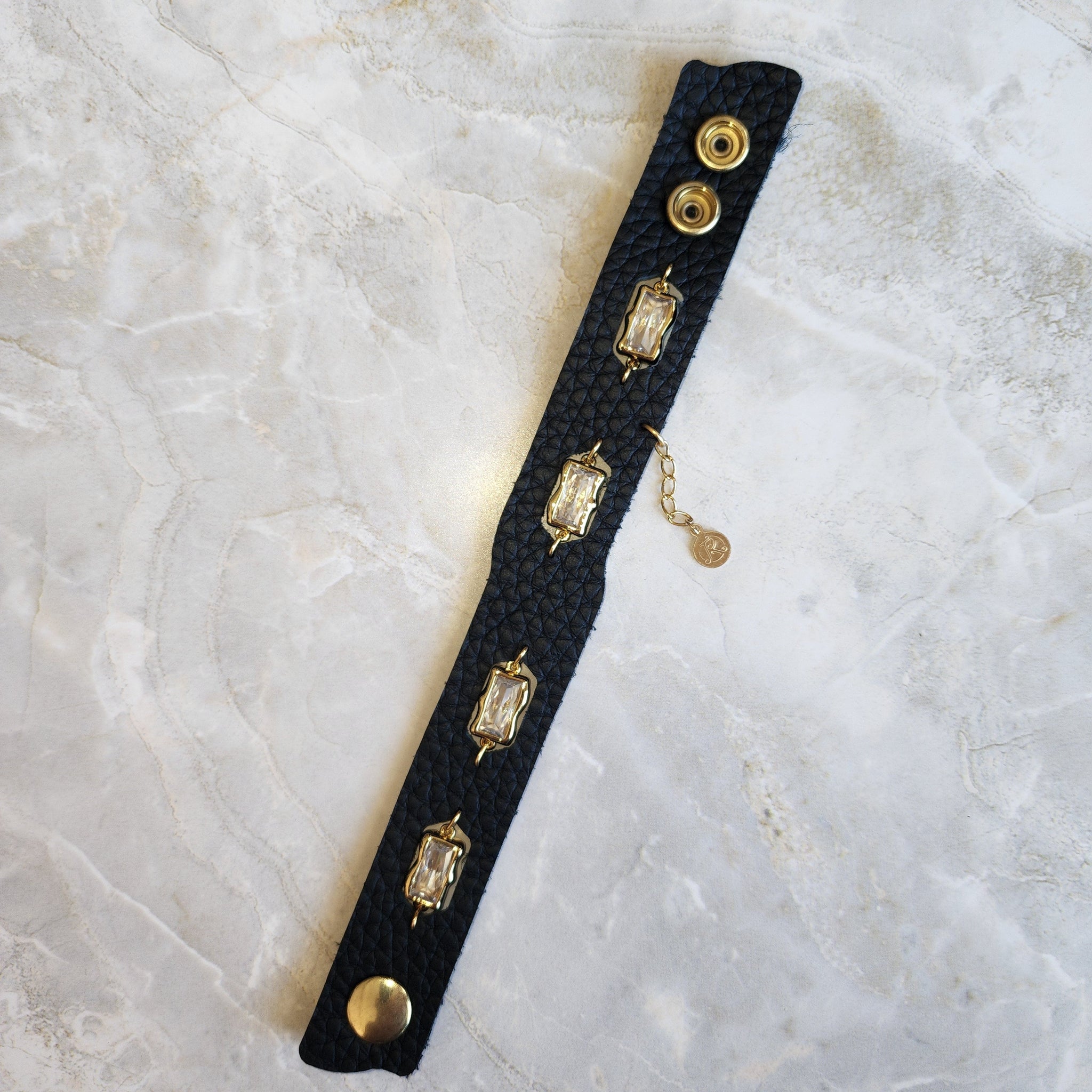The Molten cuff in black leather is set with cubic zirconia, floating within gold plated molten bezels. This piece features soft and luxurious Napa bullhide leather and measures 8 inches long by 7/8 inches wide. An abstract form with stunning crystal against golden accents...a classic statement piece.